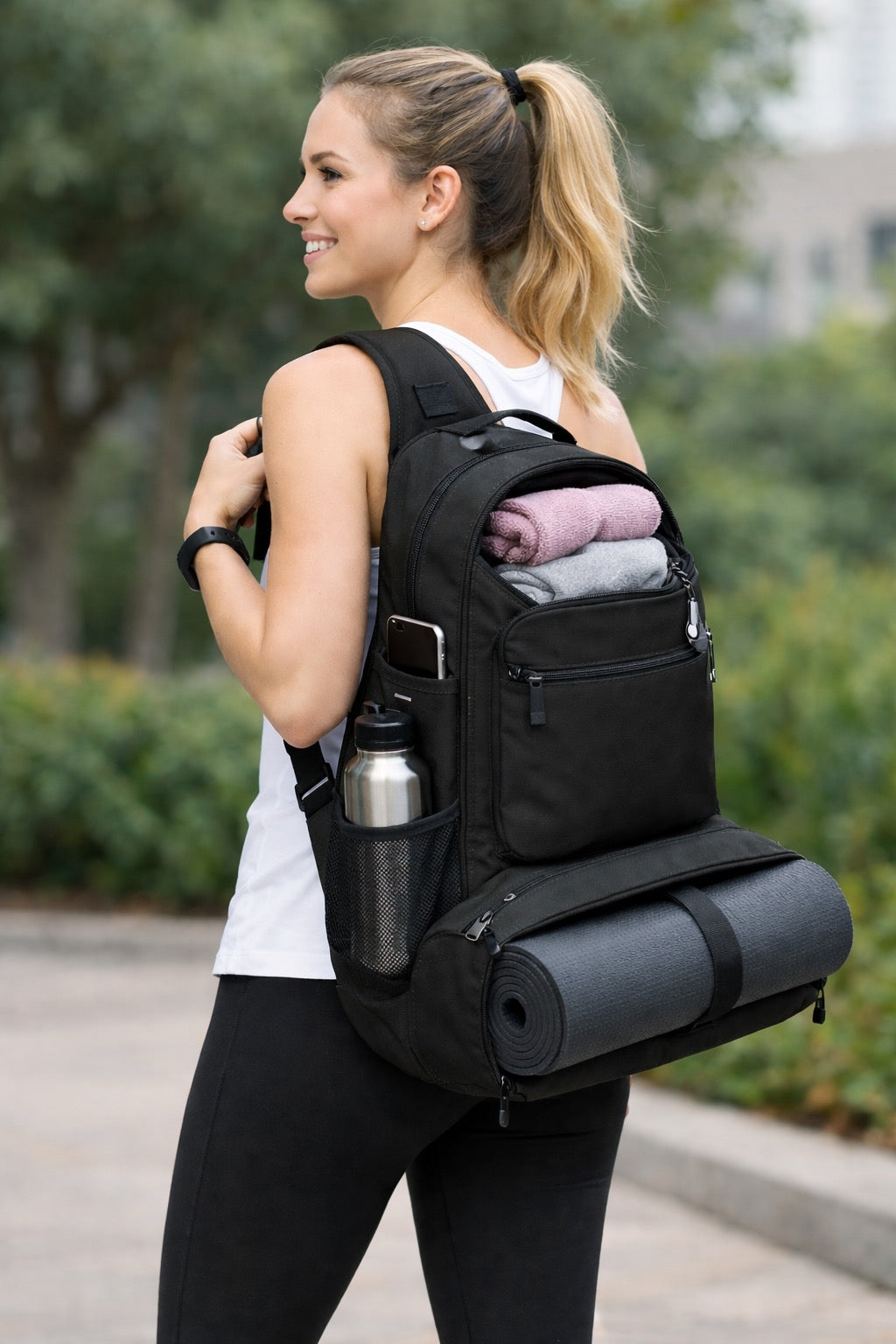 Fits your yoga mat, clothes, towel, and more — with smart compartments to keep everything in place.